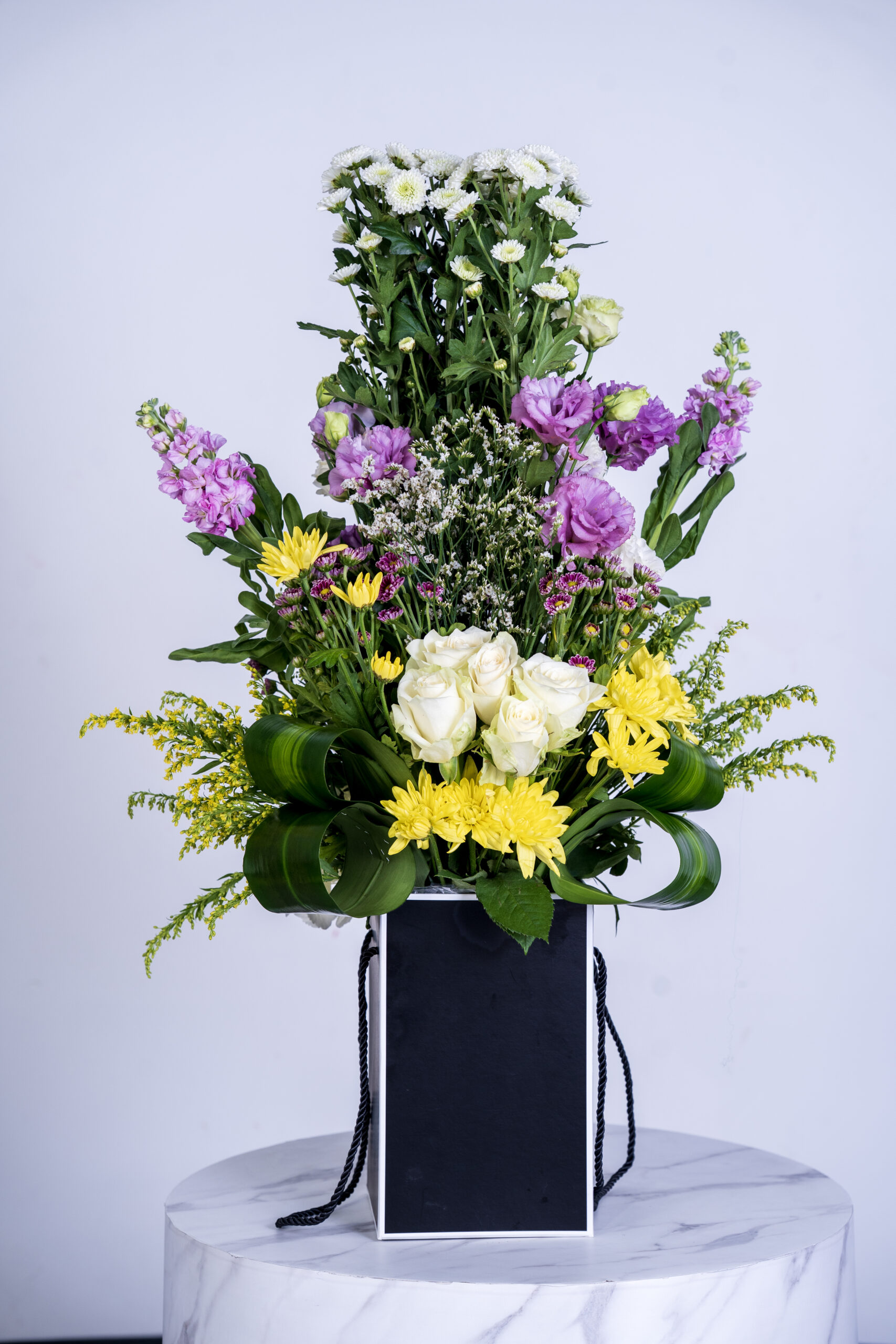 Home Flowers Baby chrysantimum and mathiola snd vesiathys white rose Chrisanthymum yellow box Arrangement