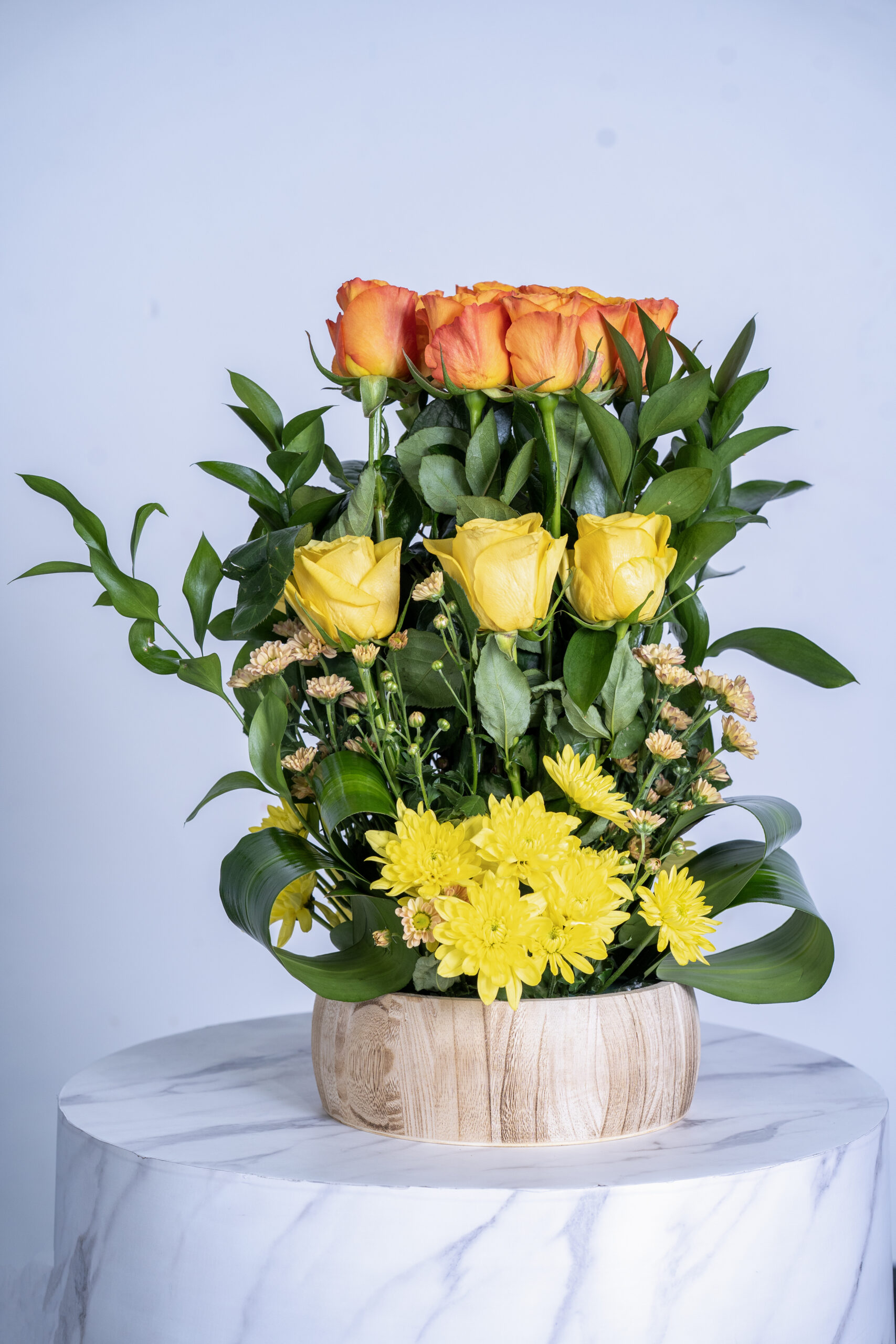 Orange rose yellow rose and cliptus green Chrysantimum yellow wooden pot aragement